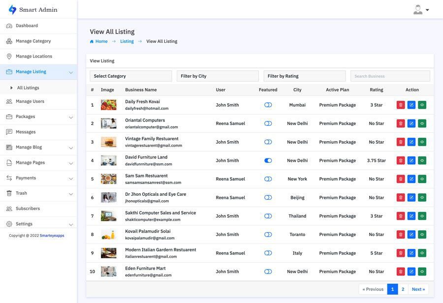 In the the Manage Review section you can manage all the use reviews and also you can remove and restore users. You can also create your own packages based on you business plan. With the transaction section track all the successful an un successful transactions. You can also manage category, location, Reviews, Messages, Subscribes and much more.