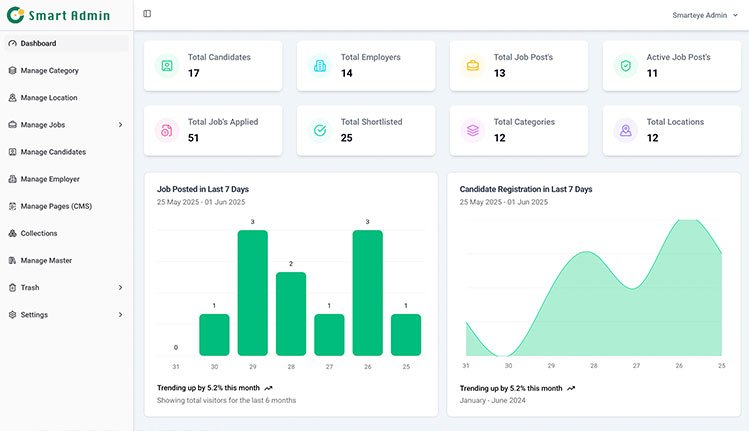 The Smart Jobs Admin Dashboard provides a powerful and user-friendly interface for managing your job portal. Admins can easily oversee job postings, employers, candidates, applications, and site settings. With intuitive navigation, real-time analytics, and detailed reports, the dashboard ensures complete control and smooth operation of the platform.