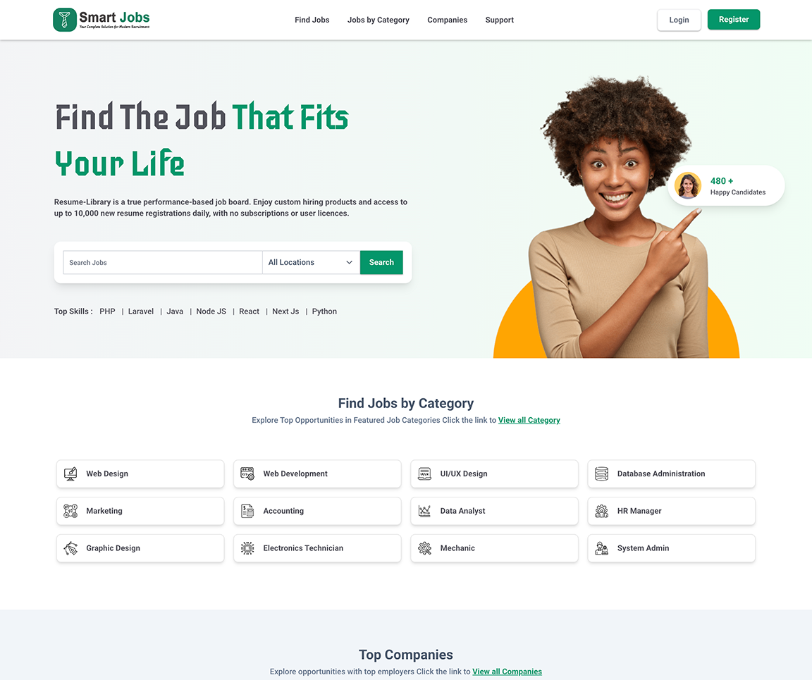 Start your job portal business within hours or take your existing job consultancy to the next level with Smart Jobs – a powerful PHP Job Portal Script built with Laravel, React, and Inertia. Designed to boost your revenue up to 10x, Smart Jobs comes with feature-rich dashboards for employers, candidates, and admin, seamless monetization options through job postings and premium listings, a modern mobile-friendly design, and complete scalability to grow your recruitment business effortlessly.